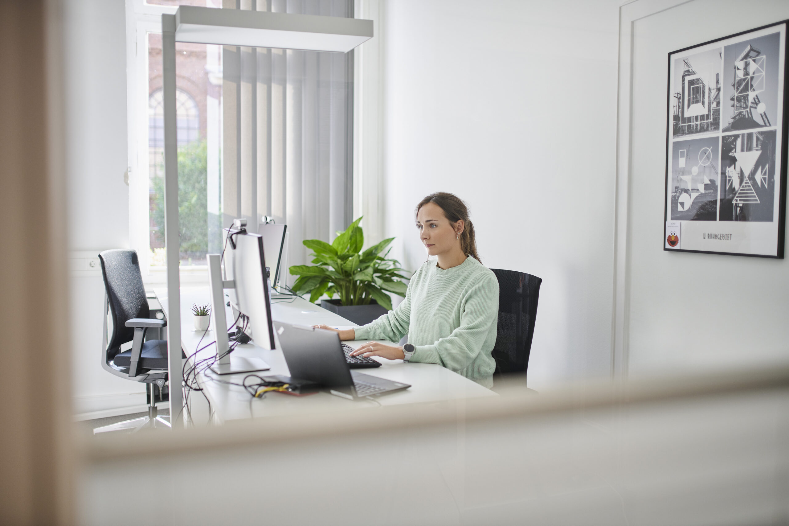 Moderne Büroarbeit: Mitarbeiterin am Schreibtisch mit Monitoren und Laptop in hellem Büro